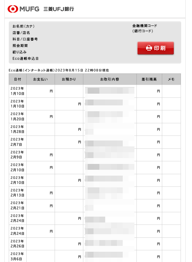 ネット銀行や通帳レス口座の場合は入出金明細のスクリーンショットかCSVやPDFをダウンロードして保存してください。通帳と同様に必ずその月の初日と月末の残高まで入ったデータにしてください。(先月分や翌月分が被っても問題ありません)(資料画像:WEB通帳の画像サンプル)