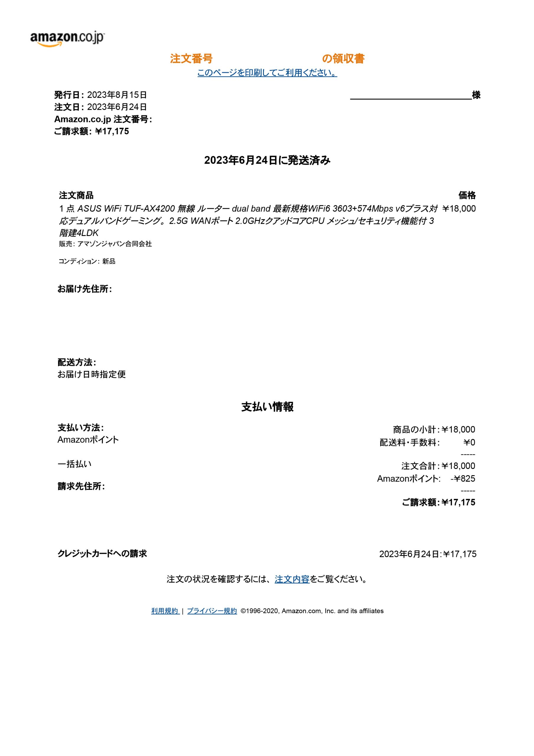 Amazonや楽天などアカウントから領収証が発行できるものは、PDFで発行してそのままファルダに保存してください。(資料画像:Amazon領収書サンプル)領収証が発行できない場合は購入した商品と金額と日付のわかるページのスクリーンショットを保存してください。