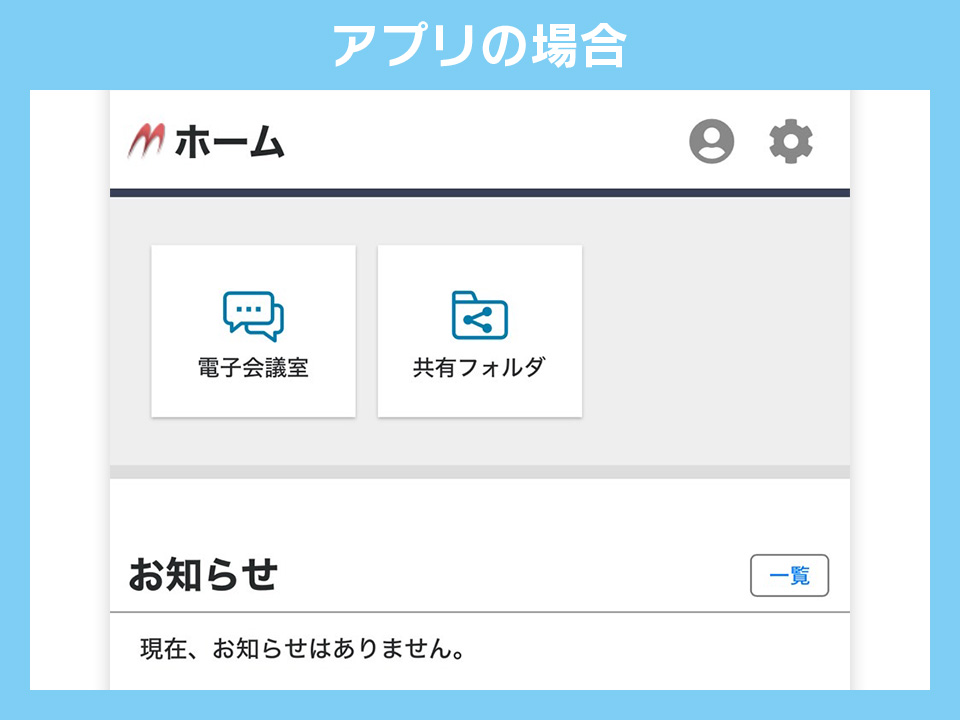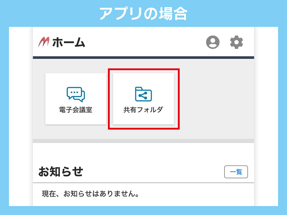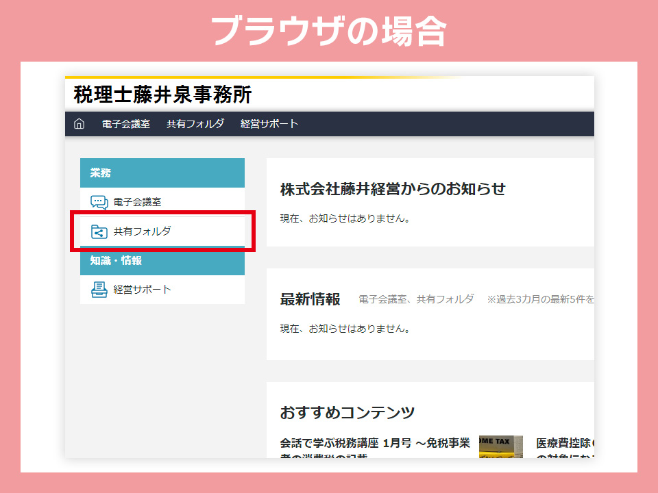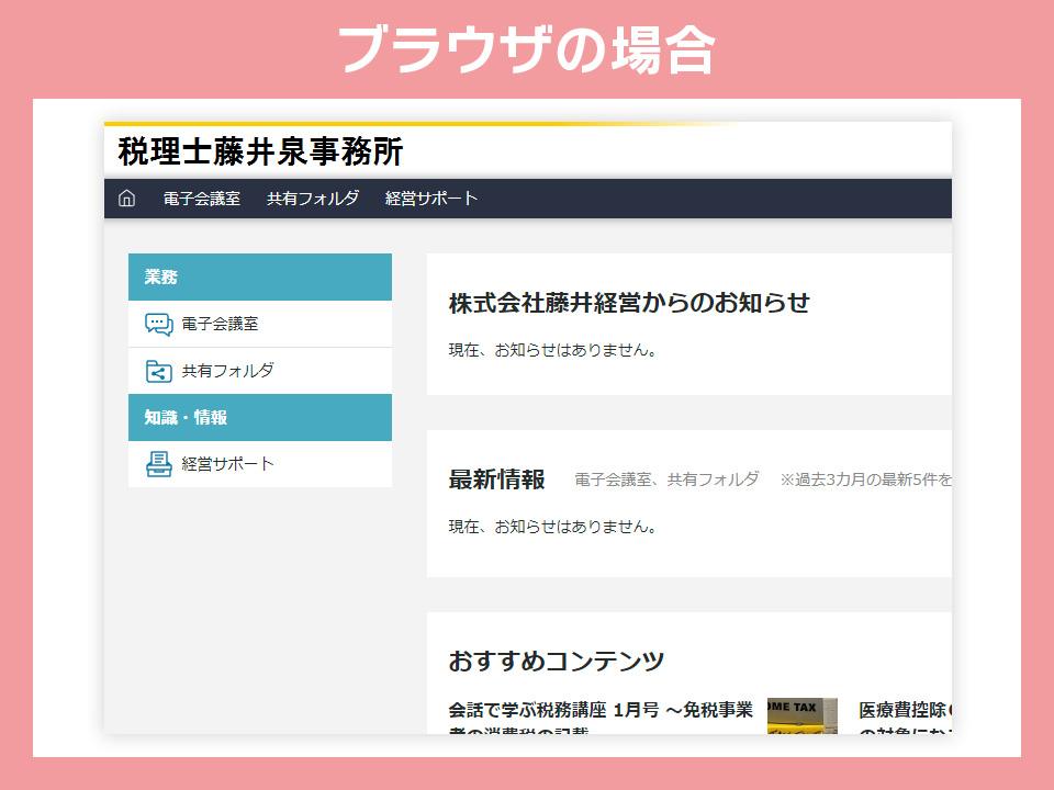 ホームのページでは共有フォルダへのリンクの他、何かCSTaxからお知らせがある場合はこちらでも表示されることがございます。また、右上の歯車アイコンからログインパスワードの変更が可能です。担当者がお伝えしたパスワードは仮パスワードとなりますので、一度は自分だけのパスワードに変更しておくことをオススメいたします。なお、「電子会議室」の機能は現在使用する予定はございません。