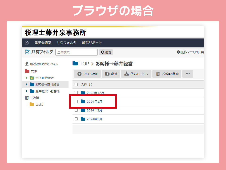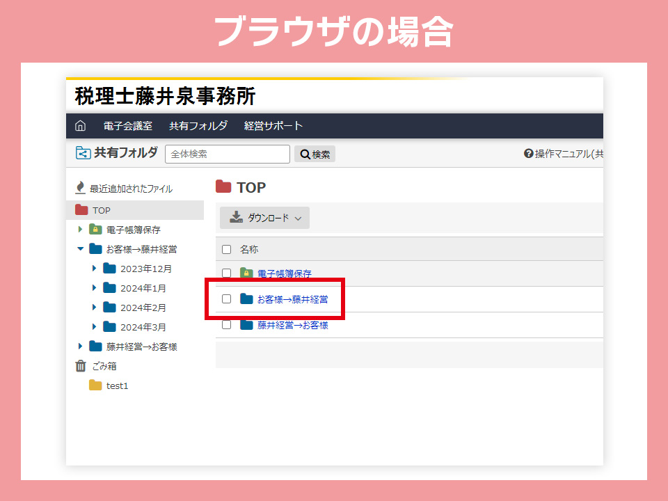 有料プランを選択すると、通常のアップロード用のフォルダとは別に電子帳簿保存法専用フォルダが用意され、CSTaxと契約している限り、電子帳簿保存法対応のフォルダは保存期間の制限が撤廃されます。領収書データをアップロードする際に、藤井経営宛のフォルダの他に電子帳簿保存法専用フォルダにもアップロードいただくことによって電子帳簿保存法に対応した形でクラウド上に整理・保存されます。ファイル名の変更などの手間が一切なく電子帳簿保存法に対応することが出来ます。