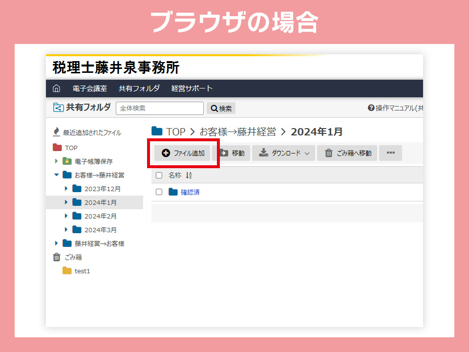 アップロードするデータを間違えてしまった時など、データを削除したい場合は、アップした直後のCSTax担当者が作業する前のデータであれば「ゴミ箱へ移動」を選択してください。ただし、一度アップロードした後、CSTax側にて整理・確認を済ませて「確認済」のフォルダに移動されたデータに修正や削除が必要な場合は、担当者までご連絡ください。
