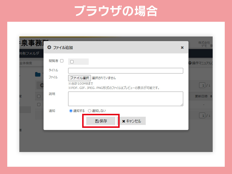基本的に「閲覧者」や「通知」の項目を触る必要はありません。また「タイトル」や「説明」の欄も無記入で問題ございませんが、もしCSTax側に該当の領収証の利用用途など伝えたい備考などがございましたらこちらに記入していただいてもOKです。