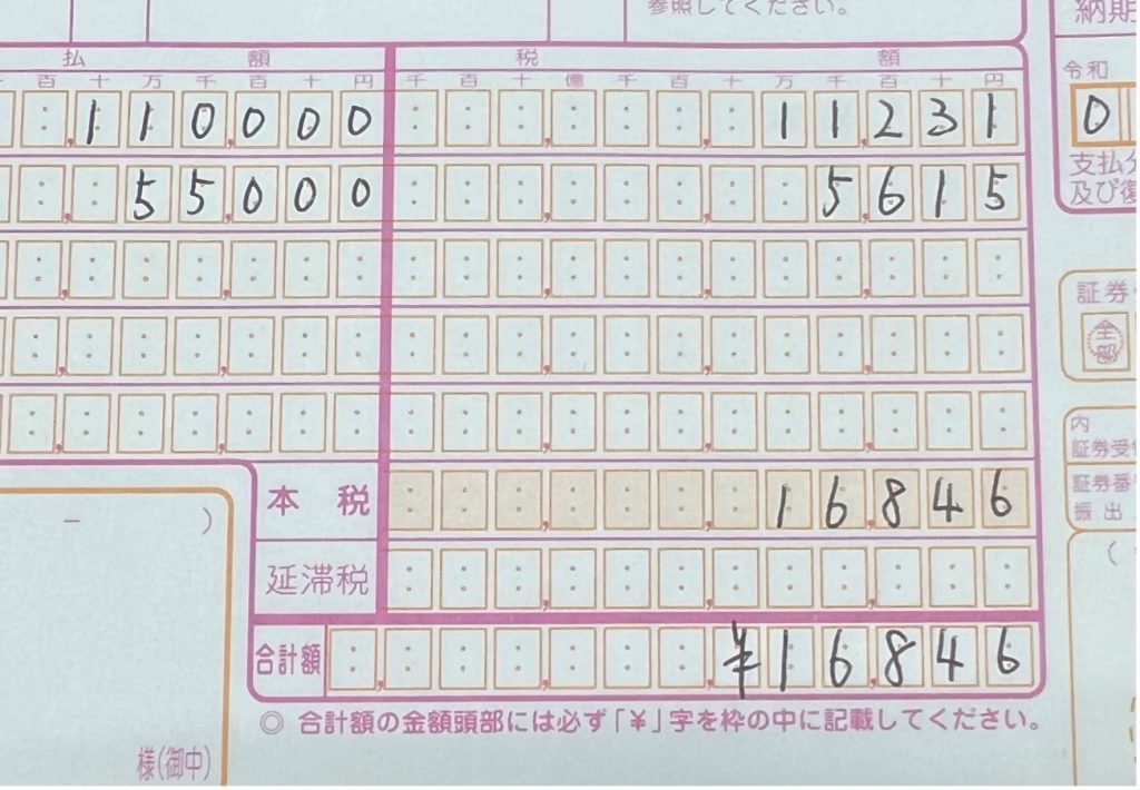税額の合計を「本税」の欄に記入し、さらに2段下の「合計額」の欄に記入します。「合計額」の欄だけは金額の頭部に¥マークを忘れずに!(納税額の偽造防止です)
